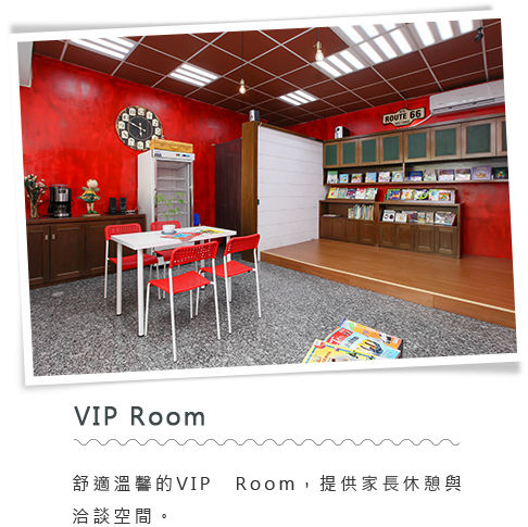 羅東校區擁有百坪室內空間,高雅溫馨的接待室,歡迎蒞臨洽詢課程相關內容。舒適溫馨的VIP Room,提供家長休憩與洽談空間。